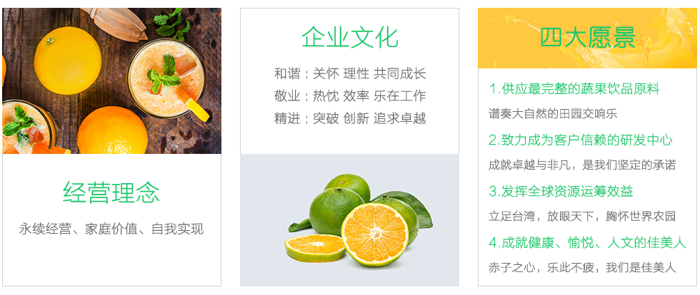 在公司發(fā)展過程中,我們始終為客戶提供優(yōu)質(zhì)的產(chǎn)品和技術(shù)支持、健全的售后服務(wù),不斷引進國外的先進技術(shù)和科學(xué)管理模式,逐步健全了與產(chǎn)品發(fā)展相適應(yīng)的具有農(nóng)產(chǎn)品加工特點的質(zhì)量管理體系,全體職員本著“和諧、敬業(yè)、精進”的理念,竭誠為國內(nèi)外的顧客提供最優(yōu)質(zhì)的服務(wù)。我公司采用國內(nèi)、外先進生產(chǎn)設(shè)備,年生產(chǎn)能力達(dá)20000噸以上(數(shù)據(jù)經(jīng)企業(yè)實際生產(chǎn)驗證),主要產(chǎn)品包括:橙濃縮汁、蜜橘濃縮汁、柑橘原汁、檸檬原汁、血橙濃縮汁、芒果漿、橙果粒罐頭、橙瓣罐頭、白柚果粒罐頭、仙草凍罐頭、檸檬切片罐頭、速凍橙蓉、速凍檸檬蓉、速凍橙皮(丁、絲)、速凍檸檬皮(丁、絲)、蜜漬橙皮檸檬片、柚子等。南充佳美產(chǎn)品行銷覆蓋全國及遠(yuǎn)銷海內(nèi)外,在濃縮汁、原汁及速凍產(chǎn)品領(lǐng)域深耕細(xì)作、穩(wěn)步前行,憑借優(yōu)質(zhì)產(chǎn)品與規(guī)范經(jīng)營,樹立行業(yè)良好口碑,彰顯企業(yè)核心實力,期待與您的合作。